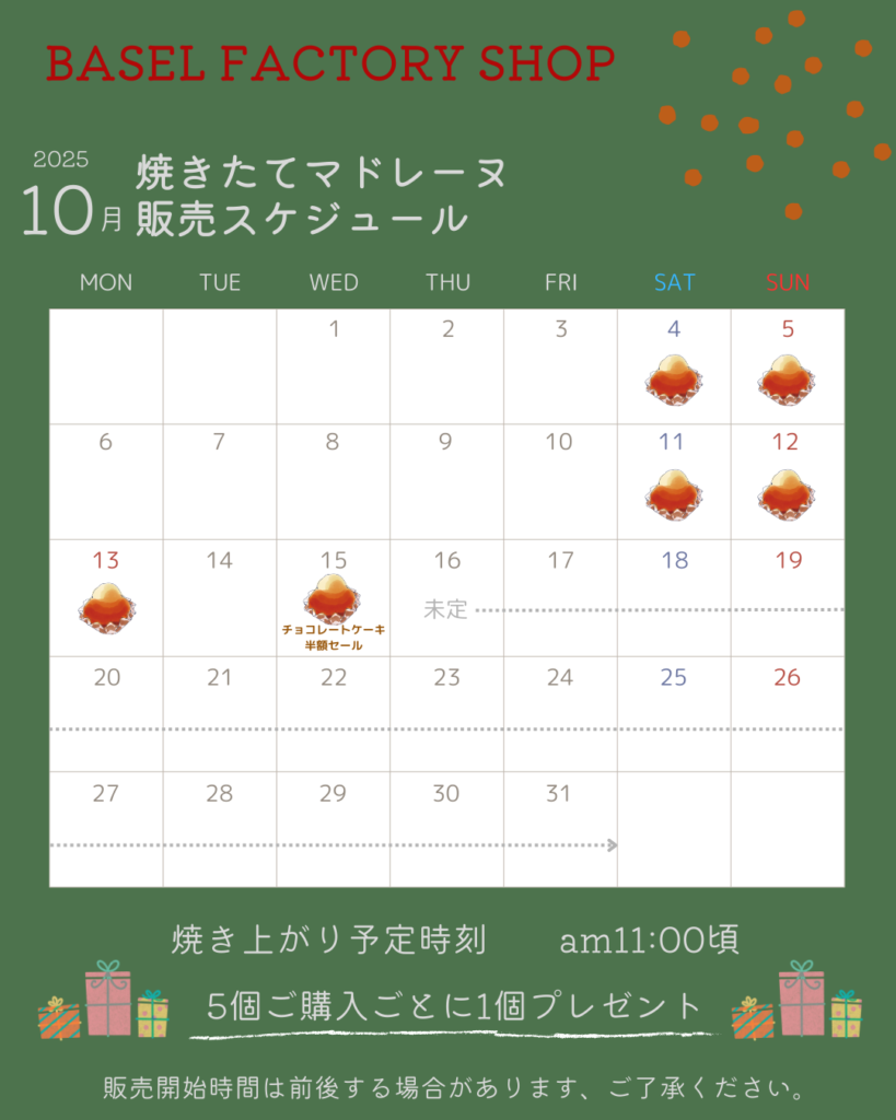 10月1〜15日の焼きたてマドレーヌ販売スケジュールのお知らせです✨