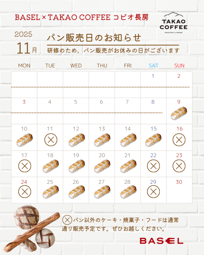 【BASEL × TAKAO COFFEE コピオ長房店】11月のパン販売日のお知らせ